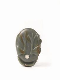 raffinato intaglio in giada verde olivastro, raffigurante l'animale con la testa rivolta all'indietro, presenta su un lato decoro di pesche, l. cm 15,5, poggiante su base in legno, alt. cm 3