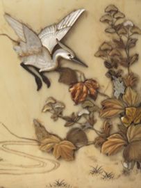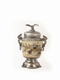 finemente lavorato in avorio impreziosito da inserti in madreperla, presenta manici e presa del coperchio di forma zoomorfa, montato in argento secondo la tecnica shibayama, alt. cm 26