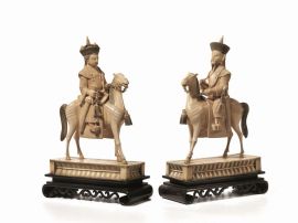 finemente intagliati in avorio, raffiguranti coppia di antenati maestosamente abbigliati a cavallo, alt. cm 33, poggianti su basi in legno alt. cm 5,5 (2)