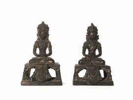 in bronzo brunito con tracce di doratura, raffiguranti due Amitayus assisi su trono rettagolare decorati a motivo floreale, alt. cm 18, alt. cm 17,5 (2)