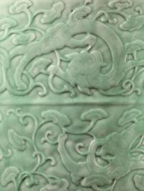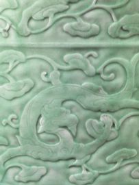 cache-pot di imponenti dimensioni in porcellana celadon, presenta decoro a leggero rilievo di draghi tra onde stilizzate, alt. cm 48, diam. cm 67,8, poggiante su base in legno finemente intagliato a decoro di pipistrelli e monete, alt. cm 51