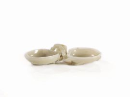 lavapennello a doppio corpo in giada verde pallido con screziature brune, finemente lavorato a forma di pesca con decoro di pipistrello e foglie, alt. cm 10