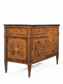 in noce intarsiato in varie essenze pregiate, fascia sottopiano a un cassetto decorato da due riserve rettangolari entro le quali sono intarsiati girali di foglie e fiori entro cornice a foglie stilizzate, due cassetti sottostanti decorati da riserva rettangolare entro cui è intarsiata una grande anfora da cui si dipartono girali di fiori e foglie entro cornice a foglie di acanto, angoli in foggia di lesene arricchite da motivi di fiori stilizzati, fianchi analogamente decorati, gambe troncopiramidali, piano in marmo nero, cm 91x129x60
