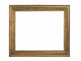 in legno intagliato e dorato, battuta e gole lisce tra modanature; ingombro cm 78x92, luce cm 58x72 (2)