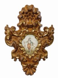 in cartapesta dipinta e parzialmente dorata, battuta a nastro pieghettato, profilo sagomato con volute fogliacee che scendono simmetricamente nella pendaglina a creare un motivo a conchiglia, e cimasa impreziosita da un decoro rocaille costituito da un nastro pieghettato a formare una conchiglia; al loro interno due pergamene dipinte a tempera raffiguranti figure popolari entro paesaggio agreste; cm 80x58 (2)