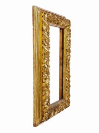 in legno intagliato e dorato, battuta a gole e gole rovesce lisce dorate, fascia bombata intagliata a motivo di ghirlanda di foglie di alloro con bacche trattenute da un nastro liscio, gole lisce scendono a muro. Doratura a guazzo in oro zecchino con preparazione a bolo; luce cm 72x58, ingombro cm102x88