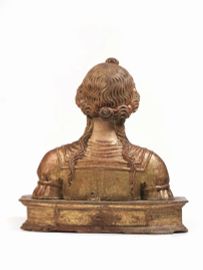 Questo elegante busto in legno policromo che raffigura una santa o una nobildonna, per il garbo dell’abbigliamento e dell’acconciatura, è opera di area senese del sec. XV di un artista non estraneo alle opere di Francesco di Valdambrino.