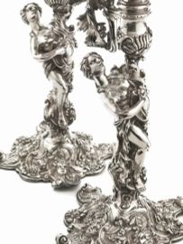 in argento, basi quadrate sagomate e decorate da volute e mascheroni, fusti modellati come figure femminili panneggiate che sostengono un tralcio vegetale da cui si dipartono quattro bracci a racemi fogliacei e su cui poggia un cartiglio con motto iscritto THIS IS OUR CHARTER, alt. cm 38,5, g 6245 (2)