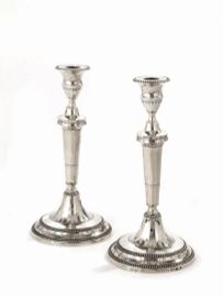 in argento, basi circolari gradinate e decorate da foglie, bacche e perlinature, fusti a colonna rastremata, bobeches con foglie lanceolate, alt. cm 29, complessivi g 720.