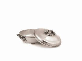 in argento di forma circolare, due anse realizzate come racemi di foglie, finale del coperchio analogamente realizzato, diam. cm 18,5, g 745