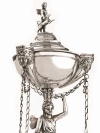 base circolare profilata da palmette, fusto modellato a figura di giovane alato stante su sfera. Coppa porta olio a tre beccucci realizzati come teste di Bacco, coperchio modellato a giovinetto con cane, ventola realizzata da due farfalle, completa di tre attrezzi, alt. cm 43, g 900