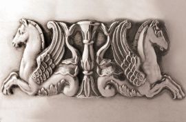 base circolare decorata da tralci di foglie, corpo decorato da cavalli alati e delfini applicati, due anse realizzate come volute di conchiglie, coperchio con presa a cornucopie contrapposte, diam. piattino 19,5, diam tazza cm 14,5, g 690