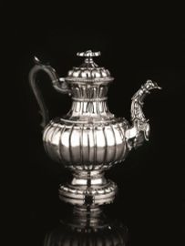 in argento di forma bombata con corpo sbalzato e scanalato, base circolare, presa a voluta in legno ebanizzato, beccuccio modellato come un'elegante elemento fogliaceo, fianale del coperchio a fiore, alt. cm 25, g 1020