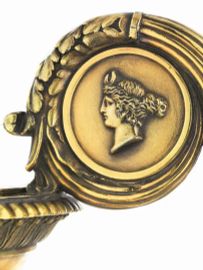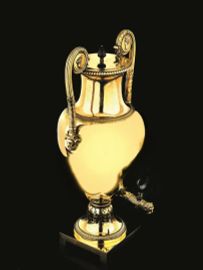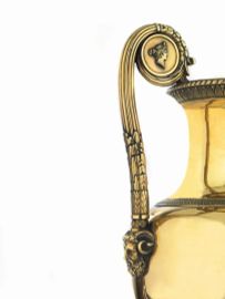 in vermeil, base quadrata su cui poggia il fusto traforato, corpo ovoidale, anse a volute vegetali con estremità a volti di satiro ed unite al collo da medaglioni con profili femminili rispettivamente raffiguranti allegoria della notte e Diana, beccuccio dritto con finale a testa ferina, alt. cm 45, g 2975