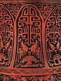 di forma ovoidale dal corpo bombato, finemente decorato nella fascia centrale da motivi continui di fiori di melograno e ramages intagliati su strati di lacca rossa, verde e giallo ocra mentre il collo e la parte inferiore sono lavorati con motivi geometrici e teste di fenici affrontati entro riserve sagomate, alt. cm 64