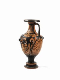 Orlo a tesa appiattita con labbro pendulo obliquo, collo cilindrico a profilo concavo, a raccordo fluido con la spalla appiattita, corpo ovoide rastremato inferiormente, piede modanato con stelo di raccordo col vaso, ansa posteriore a bastoncello, impostata dall’orlo alla spalla, anse laterali a bastoncello ritorte verso l’alto ed impostate obliquamente sul ventre