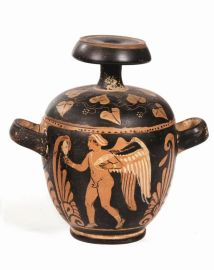 Decorazione: lato A: erote androgino, nudo e gradiente a destra, con grandi ali semiaperte, sakkos nei capelli, collane al collo e di traverso sul torace, armille ai polsi e alle caviglie, con uno specchio nella mano destra; lato B: una giovane donna stante in posizione frontale e volta a destra con un lungo chitone a pieghe, fermato in vita da una cintura, sakkos su i capelli, collana di perle; nella destra sostiene una phiale, mentre con l’altro braccio si appoggia ad una stele, incrociando parzialmente i piedi