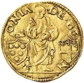 Il 4 aprile 1522 Adriano VI aveva rilasciato ai bolognesi un’autorizzazione a battere moneta secondo le antiche consuetudini. Certamente essi l’interpretarono nel modo più estensivo possibile tornando ad emettere i vecchi bolognini d’oro con il leone rampante che dopo la cacciata di Giovanni II Bentivoglio erano stati sostituiti dai ducati di stampo papale con lo stemma del pontefice (cfr. Chimienti 2009, p. 208). Lo stemma Medici è attribuibile al cardinale legato Giulio dal 1522 al 1523.