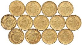 BELGIO, TREDICI MONETE IN ORO DA 20 FRANCHI