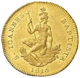 Au gr. 10,4 D/ FERDINANDVS III D G A A M D ETR Giglio di Firenze fiorito. Sotto segno dello zecchiere. R/ S IOANNES BAPTISTA Santo in figura giovanile, con nimbo circolare, seduto a s. su zolla erbosa, con la testa rivolta a d., tiene con la d. lunga croce e la s. appoggiata al terreno. Esergo 1816. Taglio cordonato. Giovanni Fabbroni zecchiere (martello).