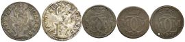 Mezzo giulio 1676 Molto raro (MIR 339/1), senza data Estremamente raro (MIR 339/2), Mezza Crazia da quattrini 2 ½ 1712 (MIR 341/1), 1713 forata (MIR 341/2), 1715 (MIR 341/3) Molto rare