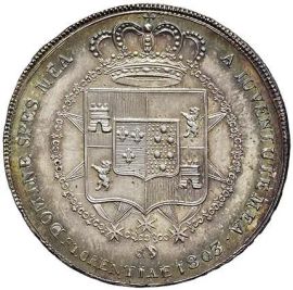 Ag D/ CAROLVS LVD D G REX ETR & M ALOYSIA R RECTRIX I I H H Busti accollati a d. Sotto segno dell’incisore e dello zecchiere R/ DOMINE SPES MEA A IUVENTUTE MEA Stemma partito, coronato, circondato dal collare del Toson d’oro da cui pendono tre insegne di ordini cavallereschi. Sotto FLORENTIAE 1803. Sul taglio LIRE CINQUE. Luigi Sieries incisore dei conii (LS in nesso). Giovanni Fabbroni zecchiere (martello).