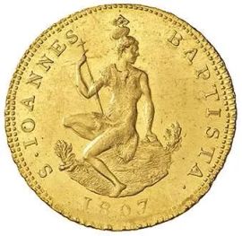 Au gr. 10,5 D/ CAROLVS L D G REX ETR & M ALOYSIA R RECTRIX Giglio di Firenze fiorito. Sotto nel giro segno dello zecchiere R/ S IOANNES BAPTISTA Santo in figura giovanile, nimbato, seduto a s. su zolla erbosa con la testa rivolta a d., tiene con la d. lunga croce e la s. appoggiata al terreno. Esergo 1807.
