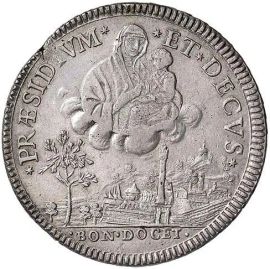 Ag D/ COMVNITAS ET SENATVS BONON Stemma inquartato cittadino. Esergo MDCCXCVI R/ PRAESIDIVM ET DECVS Madonna col Bambino tra le nuvole sopra la città. Esergo BON DOCET Chim. 1184 SPL Molto raro