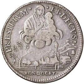 Ag D/ POPVLVS ET SENATVS BONON Stemma inquartato cittadino. Esergo P 10 1796 R/ PRAESIDIVM ET DECVS Madonna col Bambino tra le nuvole sopra la città. Esergo BON DOCET Chim. 1185 BB