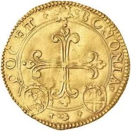 Au D/ GREGORIVS XIII PONT MAX Nel campo stemma a targa ovale gigliato del pontefice sormontato da chiavi decussate e tiara con cordoni R/ sole BONONIA rosetta DOCET Nel campo croce gigliata con stemma Sangiorgi sormontato da mitria a sinistra e quello crociato di Bologna a destra Chim. 370 Munt. 355 Molto raro BB+ foro abilmente occluso sotto le chiavi decussate
