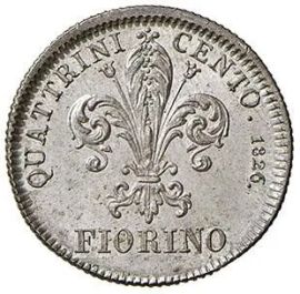 Ag D/ LEOPOLDO II A D’A GRANDUCA DI TOSCANA Testa nuda giovanile a d. Sotto segno dell’incisore e dello zecchiere. R/ QUATTRINI CENTO 1826 Giglio di Firenze fiorito. Esergo FIORINO. Taglio rigato. Pietro Cinganelli incisore dei conii (P.C.). Cosimo Ridolfi zecchiere (monti araldici).