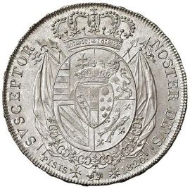 Ag D/ LEOPOLDVS II D G P I A P R H ET B A A MAGN DVX ETR Testa nuda giovanile a d. Sotto l’incollatura segno dell’incisore e dello zecchiere. R/ SUSCEPTOR NOSTER DEVS Scudo ovale, inquartato, coronato, caricato di scudetto partito e coronato, sovrapposto a due bandiere per lato, circondato in basso da collare da cui pende il Toson d’oro e altre due decorazioni cavalleresche. Esergo PISIS 1826. Taglio ornato di bacche d’alloro. Nel taglio in rilievo: • QUATTRO FIORINI •• DIECI PAOLI • Pietro Cinganelli incisore dei conii (P.C.). Cosimo Ridolfi zecchiere (monti araldici).