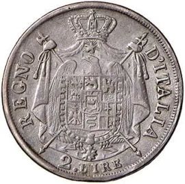 Ag D/ NAPOLEONE IMPERATORE E RE Testa a d. In basso 1812 B R/ REGNO D’ITALIA Stemma napoleonico semiovale con aquila e manto coronato con alabarde decussate. In basso 2 LIRE Chim. 1208 BB+ Raro