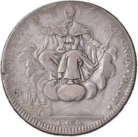 Ag D/ PIVS VI PONT MAX Nel campo stemma a targa del pontefice con chiavi in palo e tiara e in basso stemmi Archetti, a sinistra, e quello cittadino inquartato, a destra. Esergo 1795 R/ S PETRONIVS BONON PROT Nel campo santo seduto su nubi, in basso a sinistra veduta della città. Esergo 100 Chim. 1039 Munt. 201 BB