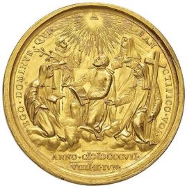 opus Tommaso Mercandetti Au gr. 40 D/ PIVS VII SEPTIMVS P M ANNO VIII Busto a sinistra con berretto, mozzetta e stola R/ EGO DOMINVS QVI SAN CTIFICO VOS ANNO CI)I)CCCVII VIII K IVN Il Triangolo della Santissima Trinità irradia i cinque nuovi Santi FDC Rarissima in oro