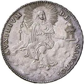 Ag D/ SEDE VACANTE MDCCCXXIII Nel campo stemma sormontato da triregno e cappello cardinalizio. In alto colomba radiante. In basso B R/ AVXILIVM DE SANCTO Nel campo la Chiesa seduta su nubi. Sotto B Chim. 1262 Munt. 66 SPL