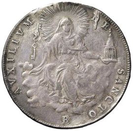 Ag D/ SEDE VACANTE MDCCCXXIII Nel campo stemma sormontato da triregno e cappello cardinalizio. In alto colomba radiante. In basso B R/ AVXILIVM DE SANCTO Nel campo la Chiesa seduta su nubi. Sotto B Chim. 1260 Munt. 4 Molto raro BB