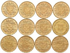 SVIZZERA, DODICI MONETE IN ORO DA 20 FRANCHI