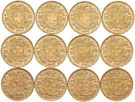 SVIZZERA, DODICI MONETE IN ORO DA 20 FRANCHI