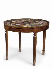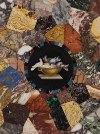 Tra le realizzazioni in mosaico minuto destinate all’arredo, ebbero grande diffusione i tavoli, che le botteghe romane realizzarono in diverse forme e tipologie. Capolavori del genere sono conservati in importanti musei internazionali come l’Ermitage di San Pietroburgo, il Victoria and Albert di Londra, la Reggia di Versailles. Una delle tipologie di maggiore successo presenta vedute di Roma entro riquadri in malachite, lapislazzulo e altre pietre. Particolarmente apprezzati furono anche i piani in cui il micromosaico era affiancato ad intarsi di marmi pregiati, il cosiddetto commesso, tipologia della quale presentiamo qui un significativo esemplare. Le parti in commesso rappresentavano vere e proprie collezioni “a vista” di pietre rare