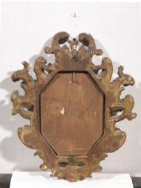 in legno intagliato e dorato, battuta ottagonale a gole lisce alla quale è applicato un ricco intaglio a giorno foggiato a volute fogliacee culminanti al centro in una cimasa a palmetta, cm 29x24; all'interno dipinto in olio su rame raffigurante Sacra famiglia con Sant'Andrea di Scuola italiana, secolo XVIII, cm 16x12
