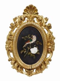 di forma ovale in marmo nero del Belgio e commesso di pietre dure raffigurante “Uccello su ramo fiorito”, cm 22,6x16. Entro cornice in legno intagliato e dorato