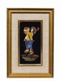 di forma rettangolare in marmo nero e commesso di pietre dure raffigurante “Cavaliere in cantina”, cm 15x8. Entro cornice in legno dorato