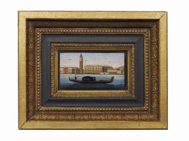 di forma rettangolare in marmo nero del Belgio e micromosaico raffigurante il “Bacino di San Marco”, cm 16,3x10. Entro cornice in legno dorato ed ebanizzato