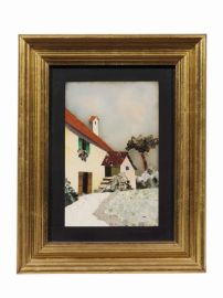 commesso di pietre dure su marmo nero, firma R. Casini in basso a destra, cm 19x14. Entro cornice in legno dorato