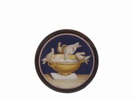 in radica di noce, tartaruga bionda e micromosaico su cassina di rame raffigurante “Le Colombe di Plinio”, alt. cm 3,2, diam. cm 7,6