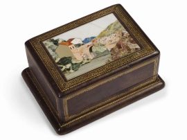 B) in legno rivestito in pelle con impressioni in oro con placca in commesso di pietre dure raffigurante “Paesaggio montano”, cm 7,5x17x13