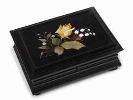C) in legno ebanizzato con placca in marmo nero e commesso di pietre dure raffigurante “Rami fioriti”, cm 8x19,5x14