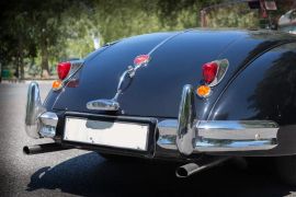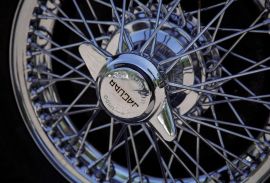 Mechanically speaking, the XK 140 was very similar to the 120, but the vehicle offered here is part of the group of XK 140 cars ordered with the “Type C” head derived directly from those used on the Jaguar C Type cars – multi-winners at Le Mans. These heads gave the engine better breathing, increasing the power from 190 to 210 horsepower and bringing the classic six cylinder XK closer to that of a racing car, even though it has only two carburetors. The steering was completely revamped to give a more modern level of drivability. The rear lever arm shock absorbers were replaced by two telescopic units: much more cutting edge and high performing. With regard to the bodywork, the XK 140 had bigger bumpers and a decidedly more comfortable passenger compartment also thanks to the repositioning of the engine and the modifications to the steering wheel and seats.