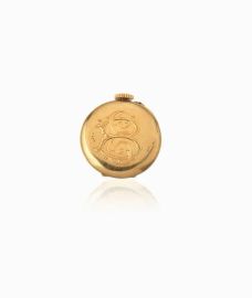 Cassa contenente il movimento in oro liscio con monogramma EB inciso. Cassa con quadrante formante la parte anteriore del bottone di forma circolare, lunetta decorata in smalto rosso decorata da rose di diamante, quadrante bianco con numeri arabi blu e rossi, lancette a foglia. Movimento a carica manuale con scappamento a cilindro??